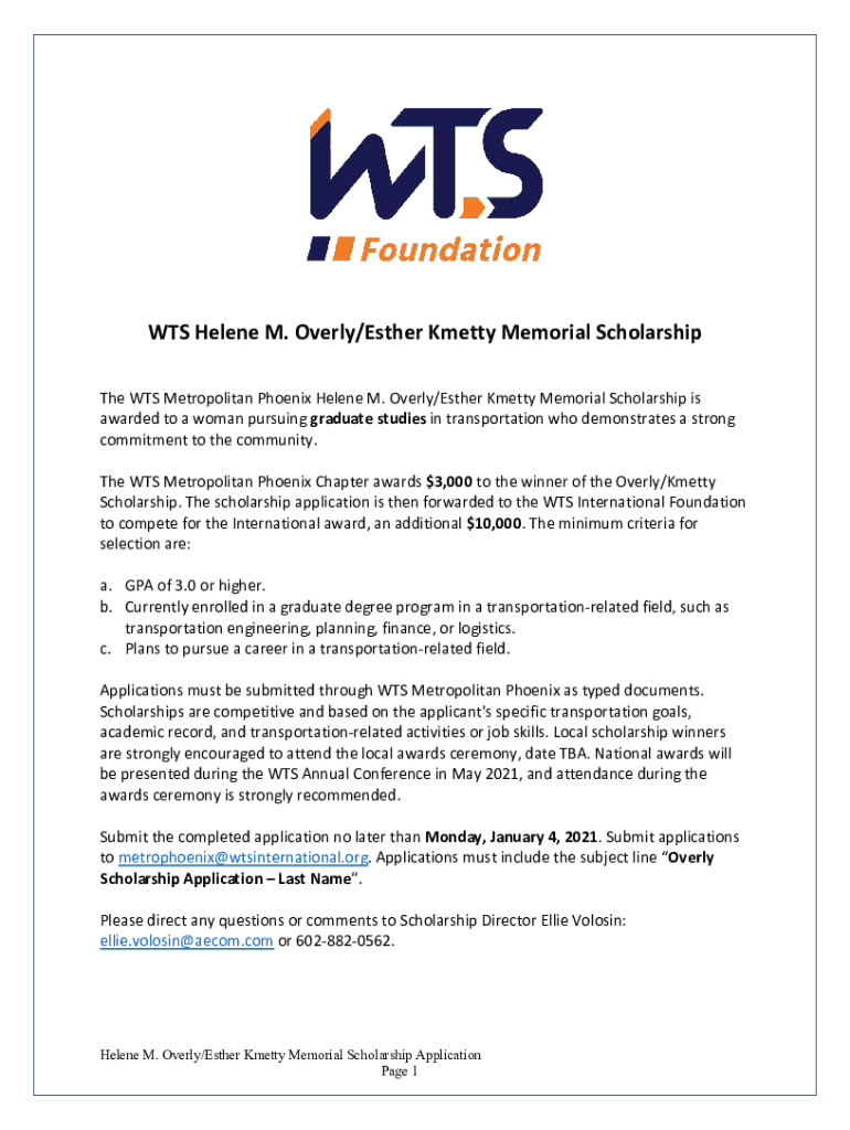 WTS Helene M. Overly/Esther Kmetty Memorial Scholarship The WTS Metropolitan Phoenix Helene M. Overly/Esther Kmetty Memorial Scholarship is awarded to a woman pursuing graduate studies in transportation