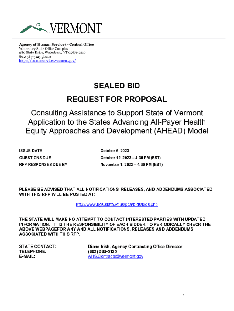 Agency of Human Services Central Office Waterbury State Office Complex 280 State Drive, Waterbury, VT 056712110 8025855125 phone https://humanservices.vermont.gov/SEALED BID REQUEST FOR PROPOSAL Consulting
