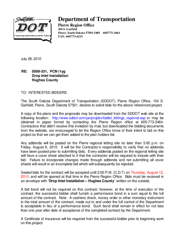 Department of Transportation Pierre Region Office Connecting South Dakota and the Nation104 S. Garfield Pierre, South Dakota 575015405 FAX: 605/7736215605/7733464July 28, 2010RE:0009351, PCN i1yg