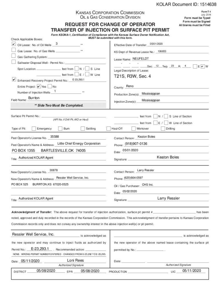 KOLAR Document ID: 1514638KANSAS CORPORATION COMMISSIONForm T1 July 2014OIL & GAS CONSERVATION DIVISIONForm must be Typed Form must be Signed All blanks must be FilledREQUEST FOR CHANGE OF OPERATOR