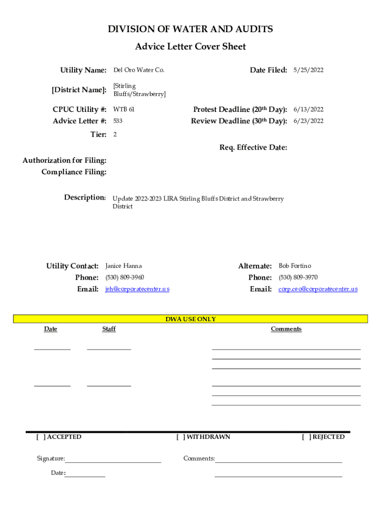 DIVISION OF WATER AND AUDITS Advice Letter Cover Sheet Utility Name: Del Oro Water Co.Date Filed: 5/25/2022[Stirling[District Name]: Bluffs/Strawberry] CPUC Utility #: WTB 61 Advice Letter #: 533Protest