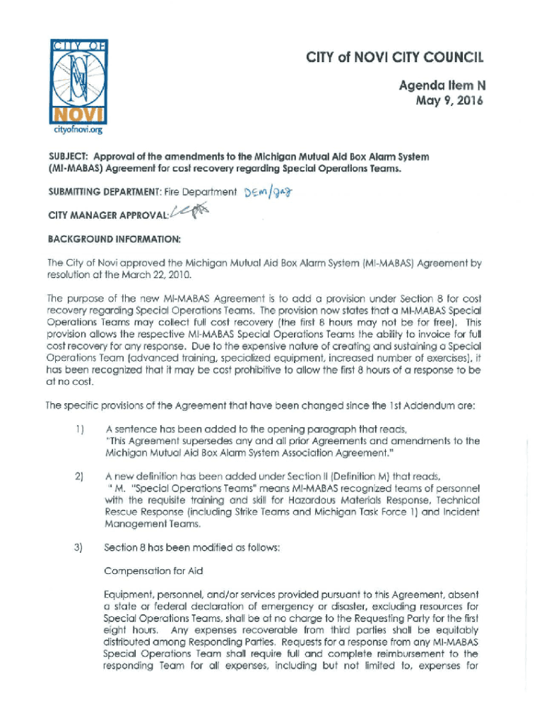 CITY of NOVI CITY COUNCIL Agenda Item N May 9, 2016SUBJECT: Approval of the amendments to the Michigan Mutual Aid Box Alarm System (MIMABAS) Agreement for cost recovery regarding Special Operations