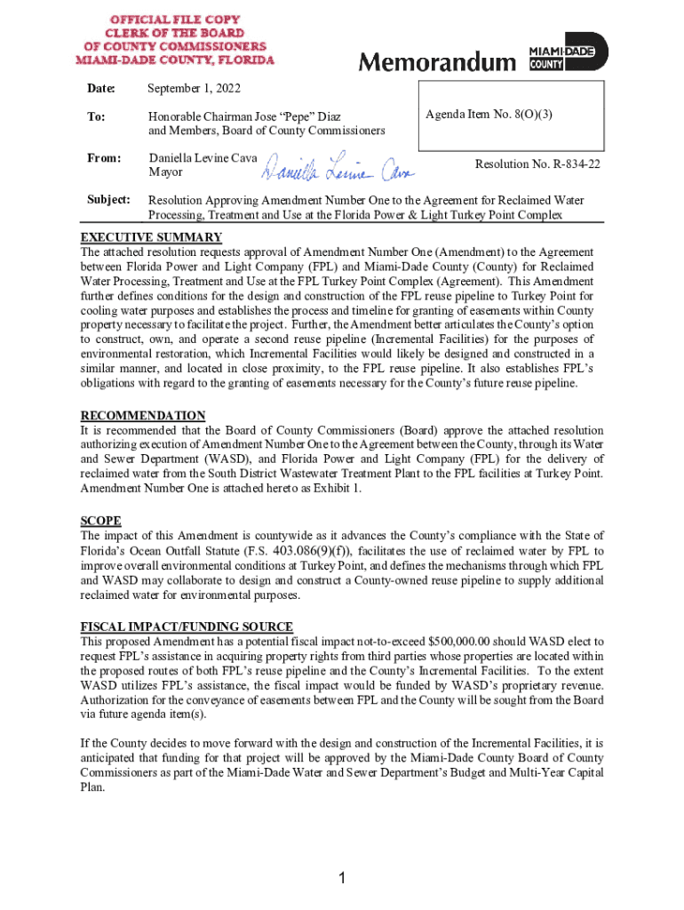 Date:September 1, 2022To:Honorable Chairman Jose Pepe Diaz and Members, Board of County CommissionersFrom:Daniella Levine Cava MayorSubject:Resolution Approving Amendment Number One to the Agreement