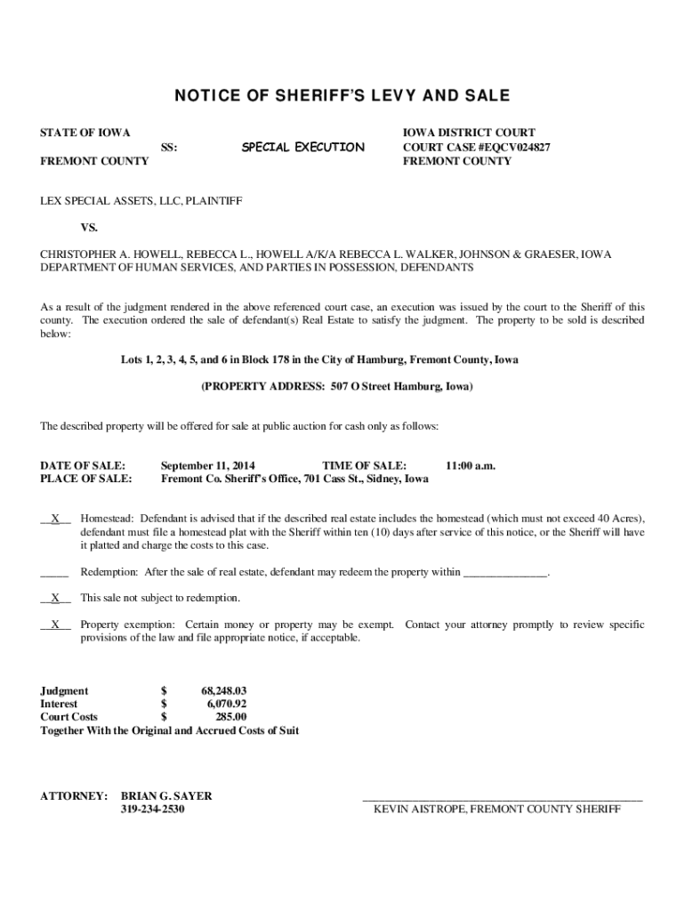 NOTICE OF SHERIFFS LEVY AND SALE STATE OF IOWASPECIAL EXECUTIONSS: FREMONT COUNTYIOWA DISTRICT COURT COURT CASE #EQCV024827 FREMONT COUNTYLEX SPECIAL ASSETS, LLC, PLAINTIFF VS. CHRISTOPHER A. HOWELL,