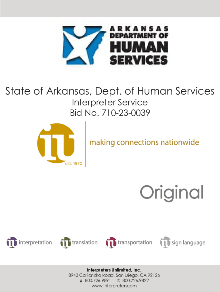 State of Arkansas, Dept. of Human Services Interpreter Service Bid No. 710230039OriginalInterpreters Unlimited, Inc. 8943 Calliandra Road, San Diego, CA 92126 p. 800.726.9891 | f: 800.726.9822 www.interpreterscom5/8/23,