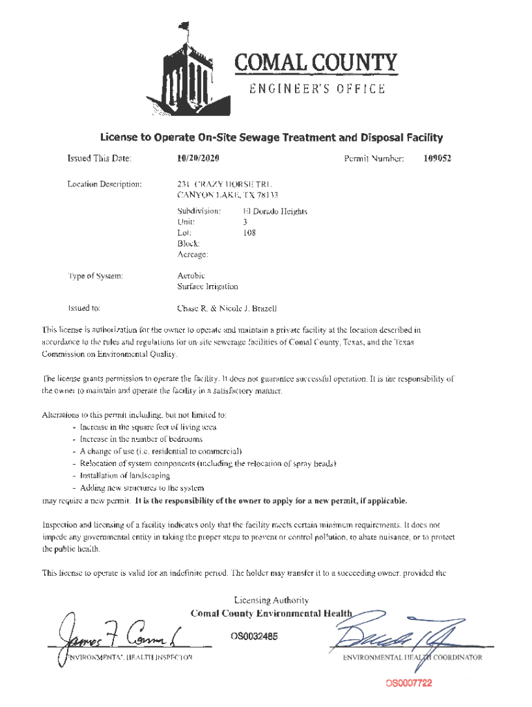 COMAL COUNTY E N G I N E E R\' S 0 F F I C ELicense to Operate OnSite Sewage Treatment and Disposal Facility Issued This Date :10/20/2020Location Description:231 CRAZY HORSE TRL CANYON LAKE, TX 78133Pennit