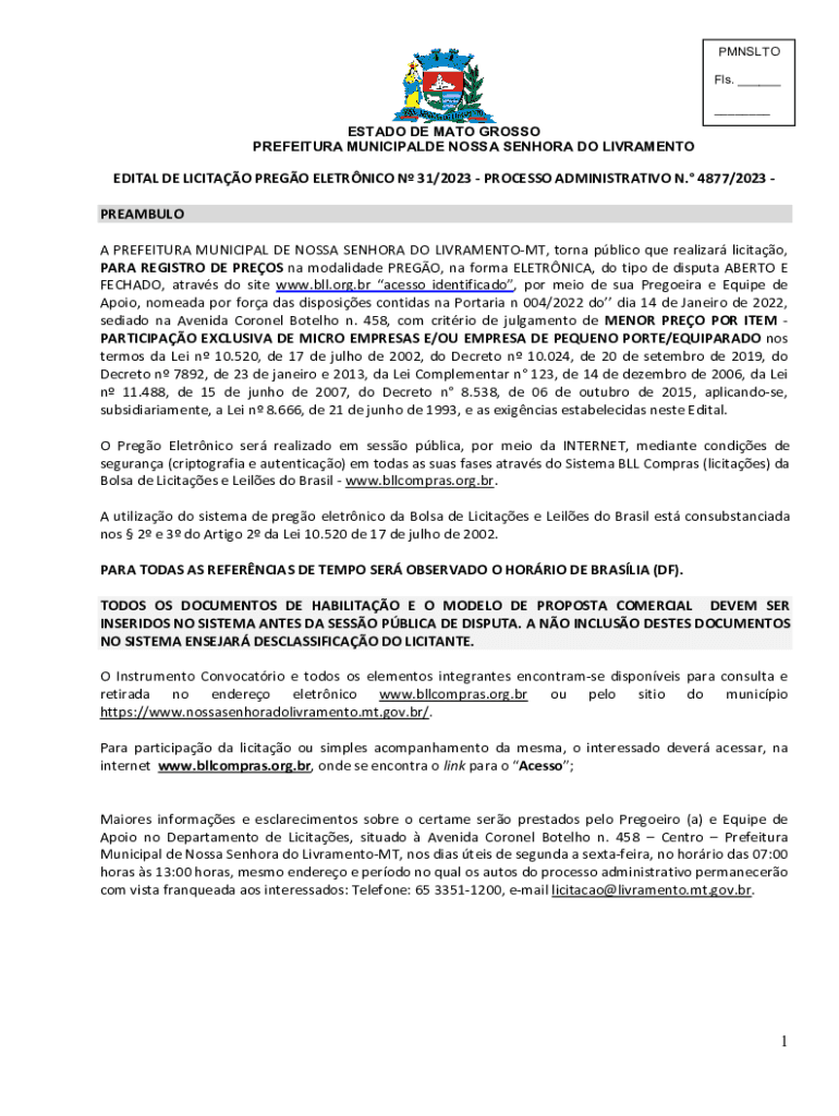 PREFECTURE MUNICIPAL DE FOSSA SENORA DO LIVRAMENTOEDITAL DE LICIT AO PRESO ELECTRIC N 31/2023 PROCESS ADMINISTRATIVE N. 4877/2023 PREAMBLE