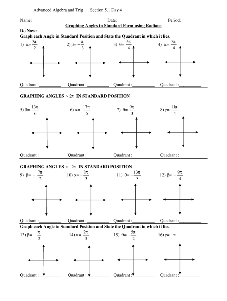 Advanced Algebra and Trig Section 5.1 Day 4 Name:___ Date:___ Period:___ Graphing Angles in Standard Form using Radians Do Now: Graph each Angle in Standard Position and State the Quadrant in which