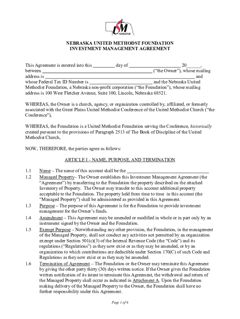 NEBRASKA UNITED METHODST FOUNDATION INVESTMENT MANAGEMENT AGREEMENT This Agreement is entered into this day of 20___, between (the Owner), whose mailing address is and whose Federal Tax ID Number