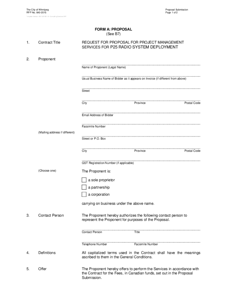 The City of Winnipeg RFP No. 6402015Proposal Submission Page 1 of 2Template Version: SrC120150116 Consulting Services RFPFORM A: PROPOSAL (See B7) 1.Contract Title2.ProponentREQUEST FOR PROPOSAL FOR