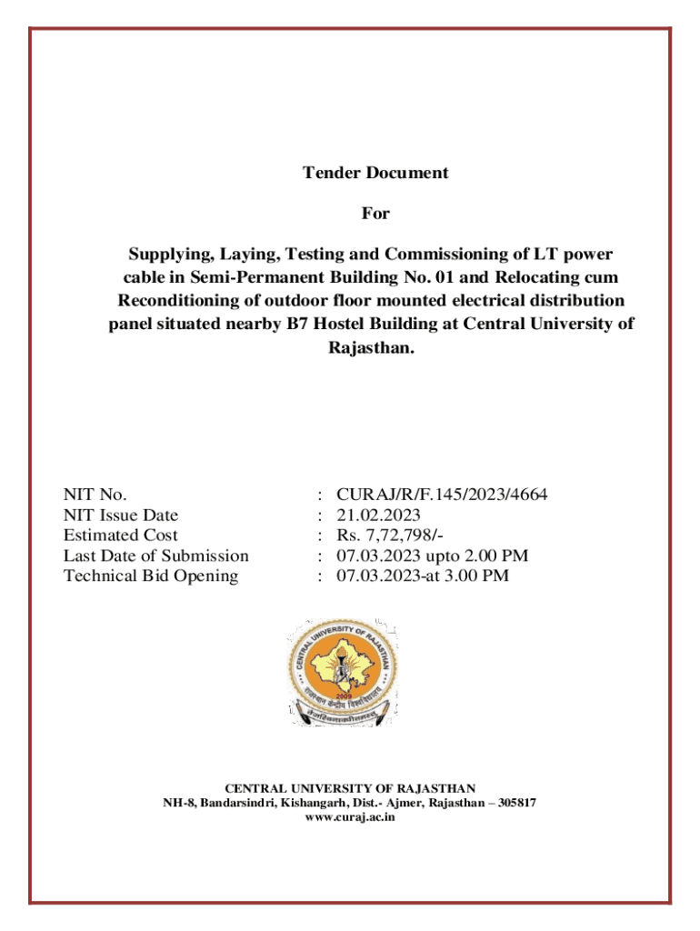 Tender Document For Supplying, Laying, Testing and Commissioning of LT power cable in SemiPermanent Building No. 01 and Relocating cum Reconditioning of outdoor floor mounted electrical distribution