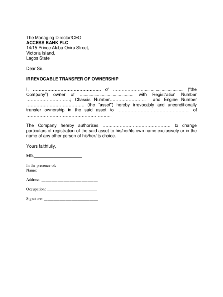 The Managing Director/CEO ACCESS BANK PLC 14/15 Prince Alaba Oniru Street, Victoria Island, Lagos State Dear Sir, IRREVOCABLE TRANSFER OF OWNERSHIP I, .. of ................................. (the