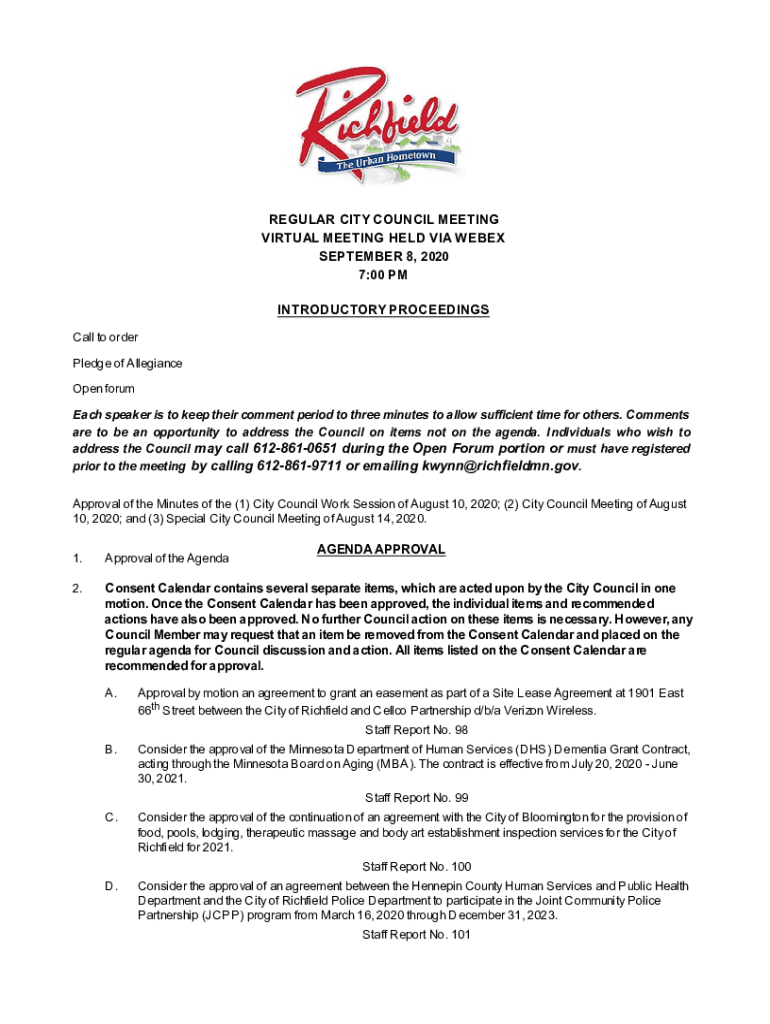 REGULAR CITY COUNCIL MEETING VIRTUAL MEETING HELD VIA WE BEX SEPTEMBER 8, 2020 7:00 PM INTRODUCTORY PROCEEDINGS Call to order Pledge of Allegiance Open forum Each speaker is to keep their comment