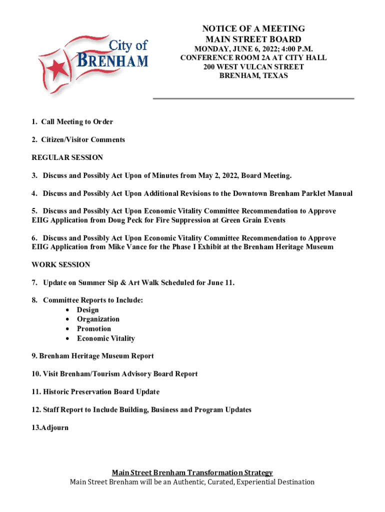 Get the free Discuss and Possibly Act Upon Additional Revisions to the Downtown Brenham Parklet M...