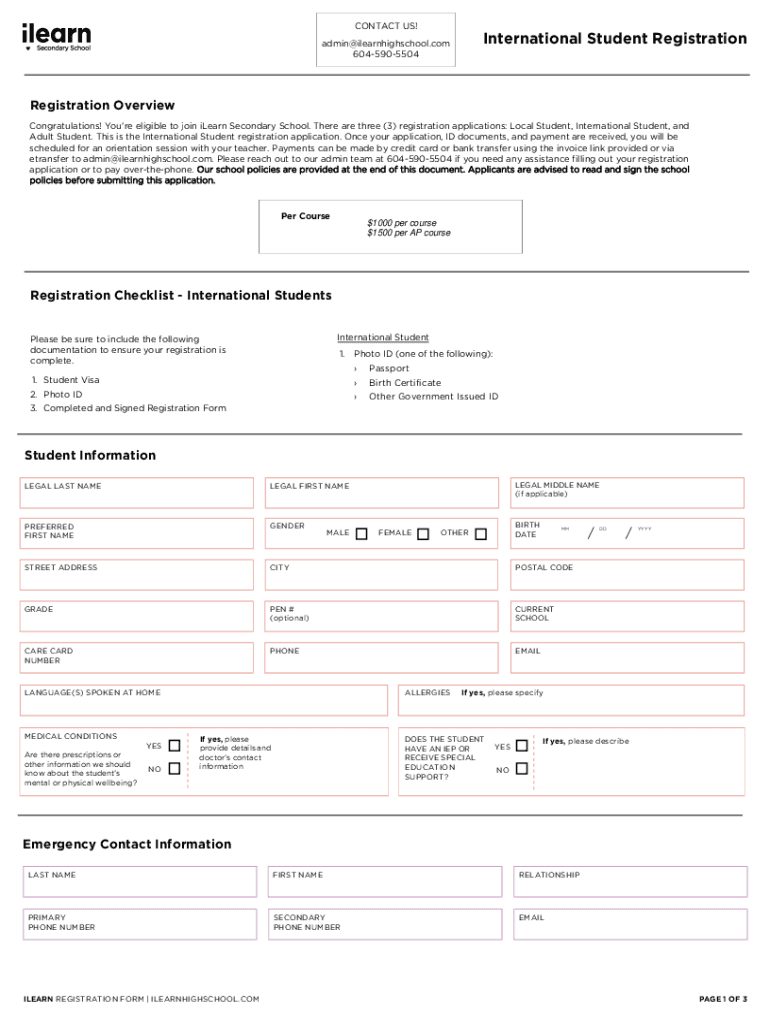 CONTACT US!International Student Registrationadmin@ilearnhighschool.com 6045905504Registration Overview Congratulations! You\'re eligible to join iLearn Secondary School. There are three (3) registration