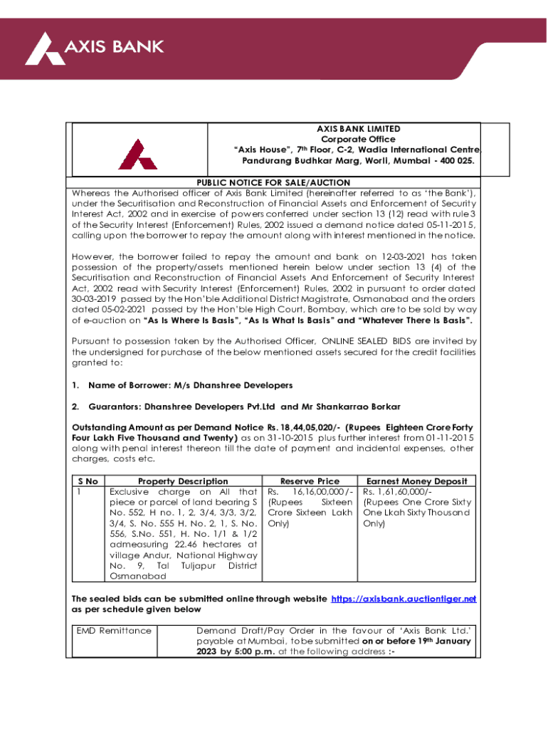 AXIS BANK LIMITED Corporate Office Axis House, 7th Floor, C2, Wadia International Centre, Pandurang Budhkar Marg, Worli, Mumbai 400 025. PUBLIC NOTICE FOR SALE/AUCTION Whereas the Authorised officer