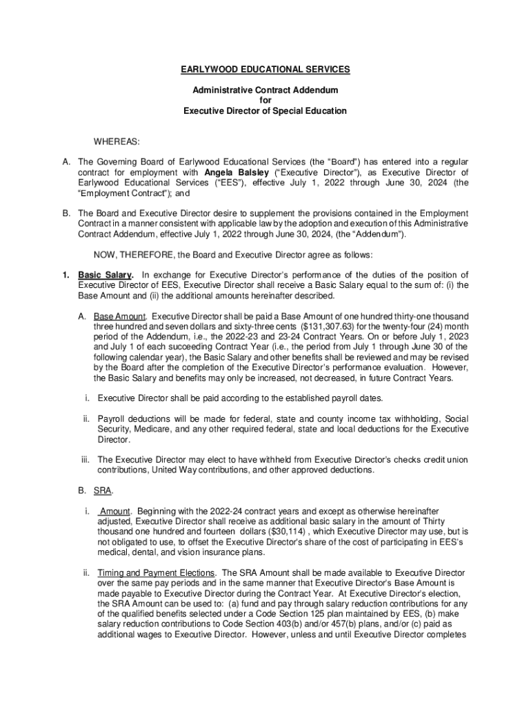 EARLYWOOD EDUCATIONAL SERVICES Administrative Contract Addendum for Executive Director of Special EducationWHEREAS: A. The Governing Board of Earlywood Educational Services (the Board) has entered