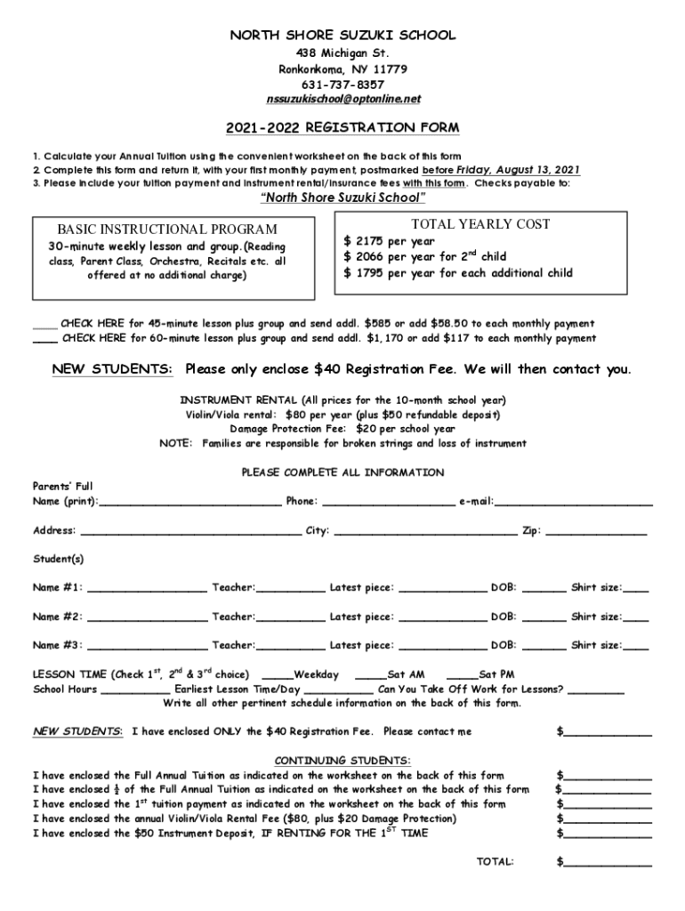 NORTH SHORE SUZUKI SCHOOL 438 Michigan St. Ronkonkoma, NY 11779 6317378357nssuzukischool@optonline.net20212022 REGISTRATION FORM 1. Calculate your Annual Tuition using the convenient worksheet on