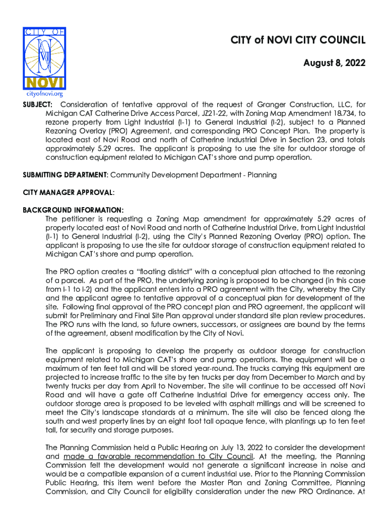 CITY of NOVA CITY COUNCIL August 8, 2022SUBJECT: Consideration of tentative approval of the request of Granger Construction, LLC, for Michigan CAT Catherine Drive Access Parcel, JZ2122, with Zoning