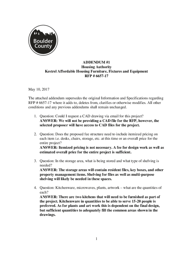 ADDENDUM #1 Housing Authority Kestrel Affordable Housing Furniture, Fixtures and Equipment RFP # 665717May 10, 2017 The attached addendum supersedes the original Information and Specifications regarding