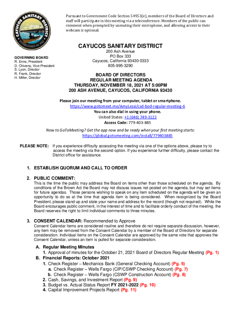 Pursuant to Government Code Section 54953(e), members of the Board of Directors and staff will participate in this meeting via a teleconference. Members of the public can comment when prompted by