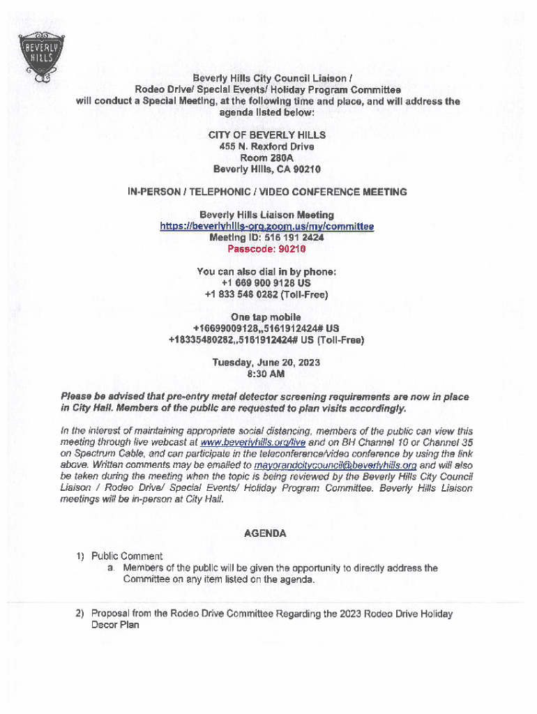 Beverly Hills City Council Liaison I Rodeo Drivel Special Eventsl Holiday Program Committee will conduct a Special Meeting, at the following time and place, and will address the agenda listed below: