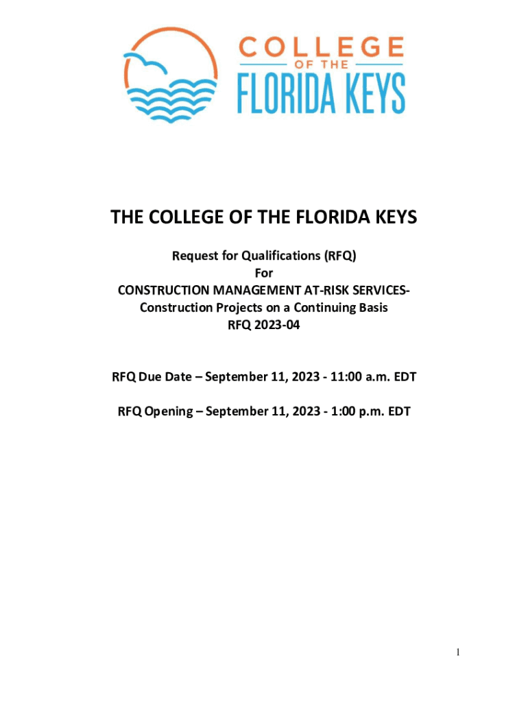 THE COLLEGE OF THE FLORIDA KEYS Request for Qualifications (RFQ) For CONSTRUCTION MANAGEMENT ATRISK SERVICESConstruction Projects on a Continuing Basis RFQ 202304RFQ Due Date September 11, 2023 11:00