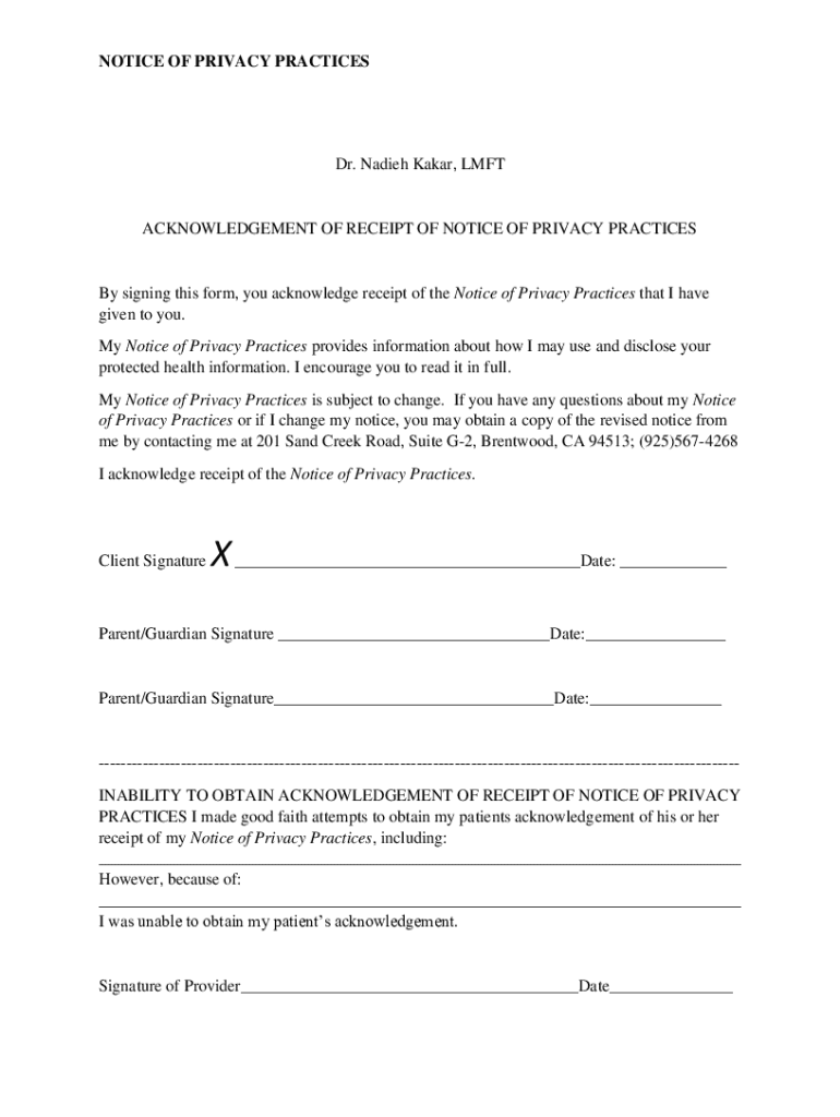 NOTICE OF PRIVACY PRACTICESDr. Nadieh Kakar, LMFTACKNOWLEDGEMENT OF RECEIPT OF NOTICE OF PRIVACY PRACTICESBy signing this form, you acknowledge receipt of the Notice of Privacy Practices that I have