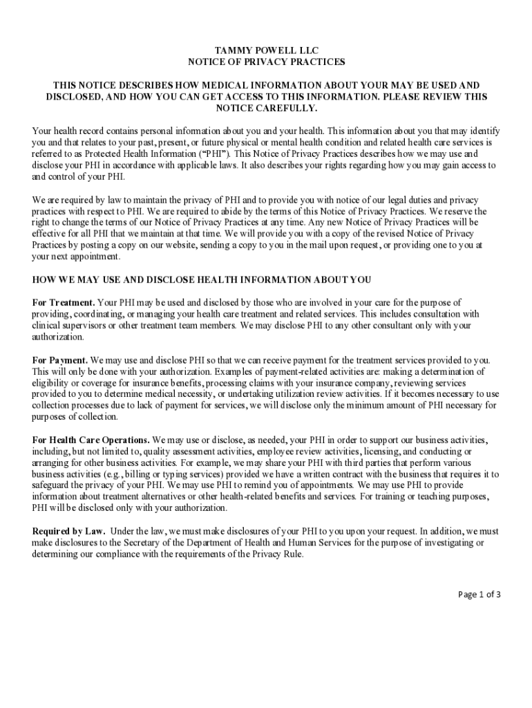TAMMY POWELL NOTICE OF PRIVACY PRACTICESTHIS NOTICE DESCRIBES HOW MEDICAL INFORMATION ABOUT YOUR MAY BE USED AND