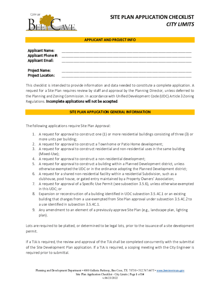 SITE PLAN APPLICATION CHECKLIST CITY LIMITS APPLICANT AND PROJECT INFO Applicant Name: ___ Applicant Phone #: ___ Applicant Email: ___ Project Name: Project Location:___ ___This checklist is intended