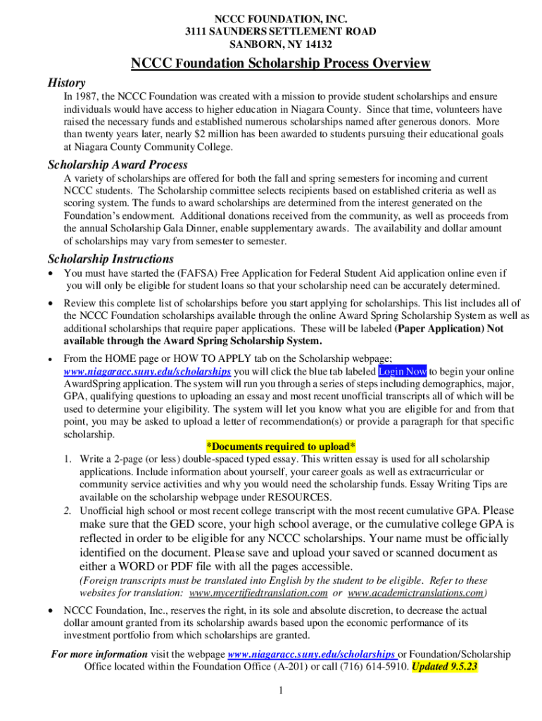 NCCC FOUNDATION, INC. 3111 SAUNDERS SETTLEMENT ROAD SANBORN, NY 14132NCCC Foundation Scholarship Process Overview History In 1987, the NCCC Foundation was created with a mission to provide student