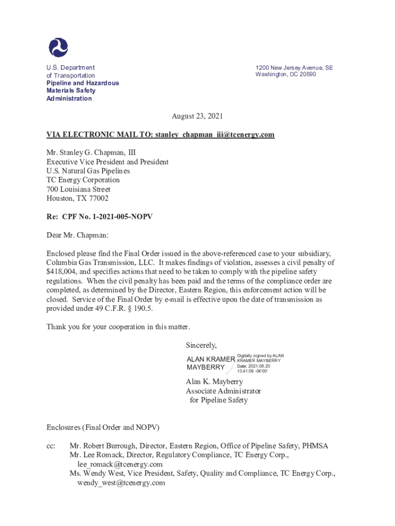 U.S. Department of Transportation Pipeline and Hazardous Materials Safety Administration1200 New Jersey Avenue, SE Washington, DC 20590August 23, 2021 VIA ELECTRONIC MAIL TO: stanley chapman iii@tcenergy.com