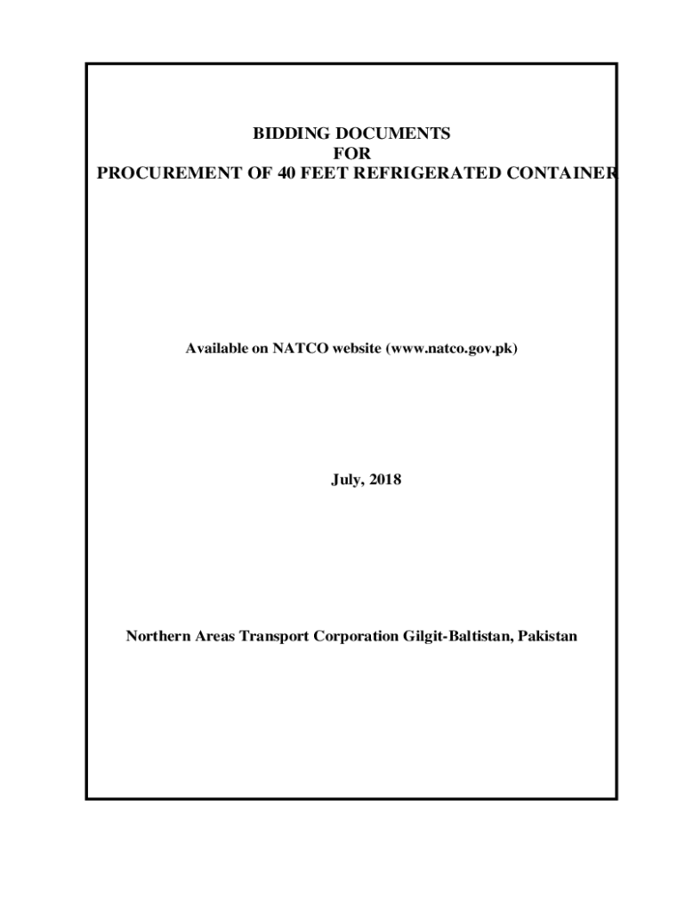 PROCUREMENT OF 40 FEET REFRIGERATED CONTAINERAvailable on NATO website (www.natco.gov.pk)July, 2018Northern Areas Transport Corporation GilgitBaltistan, PakistanSUMMARY OF CONTENTS/Subject(I)INVITATION