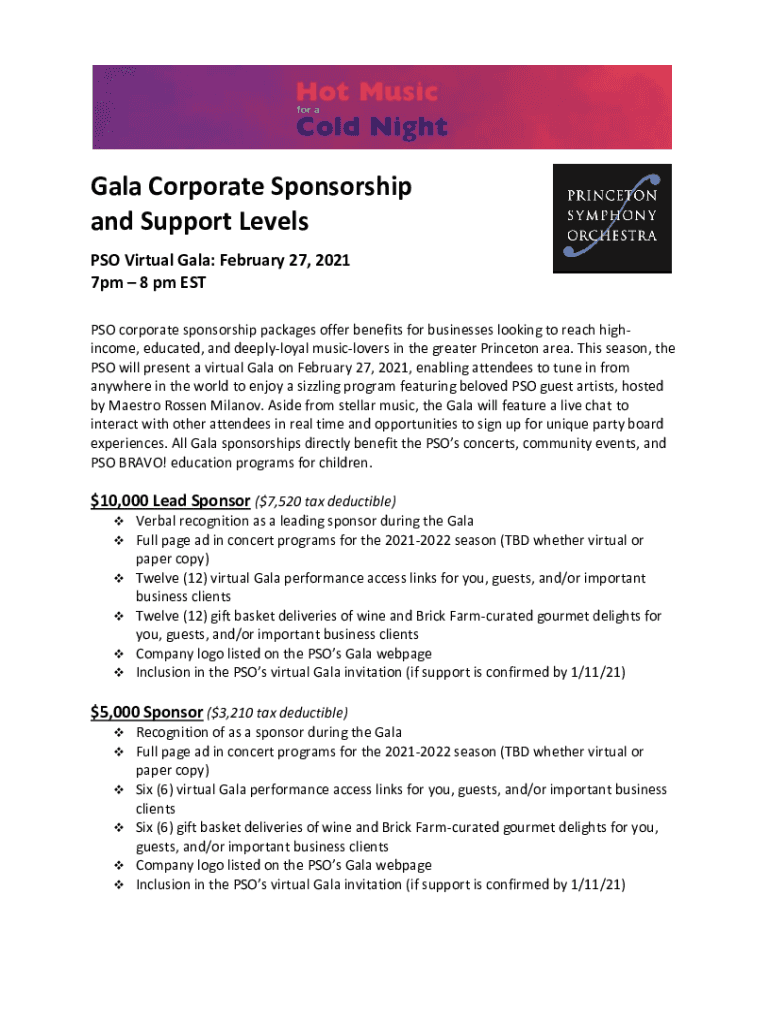 Gala Corporate Sponsorship and Support Levels PSO Virtual Gala: February 27, 2021 7pm 8 pm EST PSO corporate sponsorship packages offer benefits for businesses looking to reach highincome, educated,