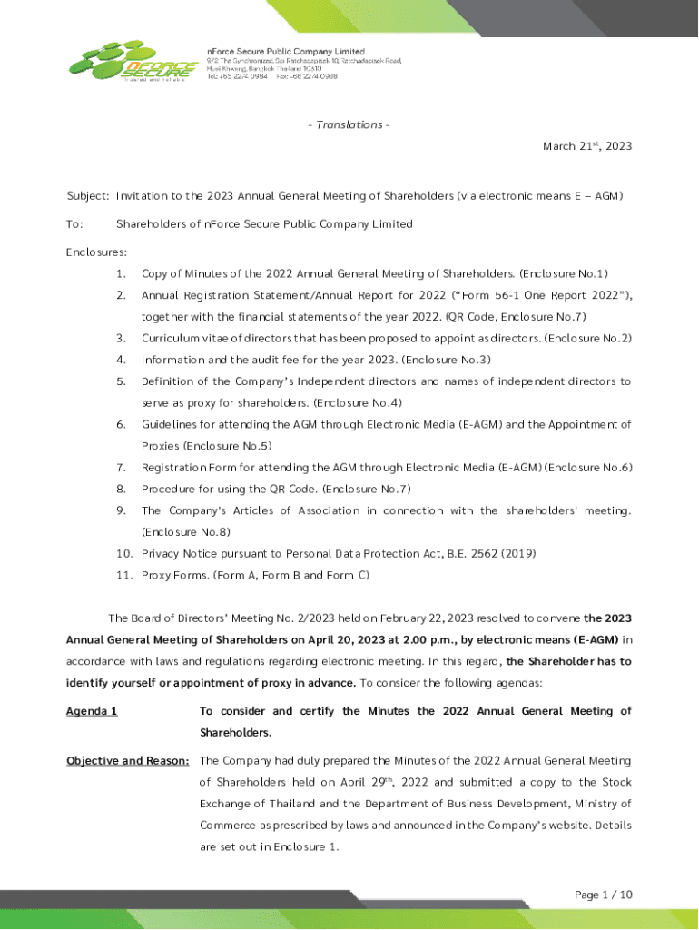Translations March 21st, 2023Subject: Invitation to the 2023 Annual General Meeting of Shareholders (via electronic means E AGM) To:Shareholders of force Secure Public Company LimitedEnclosures: 1.