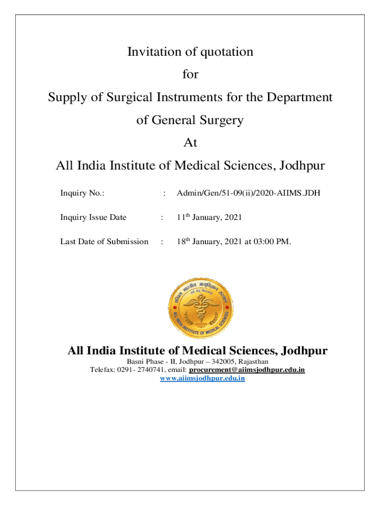 Invitation of quotation for Supply of Surgical Instruments for the Department of General Surgery At All India Institute of Medical Sciences, Jodhpur Inquiry No.::Admin/Gen/5109(ii)/2020AIIMS.JDHInquiry