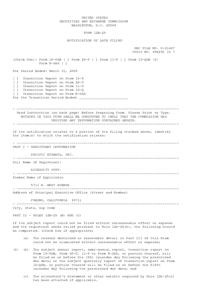 UNITED STATES SECURITIES AND EXCHANGE COMMISSION WASHINGTON, D.C. 20549 FORM 12B25 NOTIFICATION OF LATE FILING SEC FILE NO. 021467 CUSIP NO. 69423U 10 7 (Check One): Form 10KSB [ ] Form 20F [ ] Form
