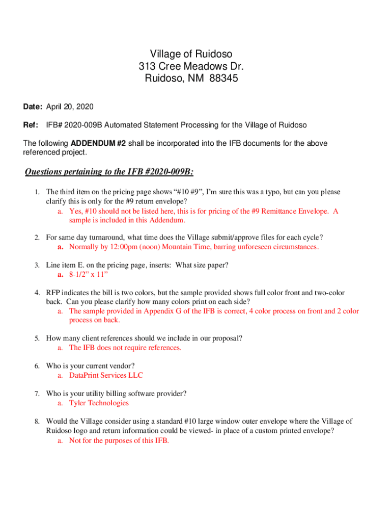 Village of Ruidoso 313 Cree Meadows Dr. Ruidoso, NM 88345 Date: April 20, 2020 Ref:IFB# 2020009B Automated Statement Processing for the Village of RuidosoThe following ADDENDUM #2 shall be incorporated