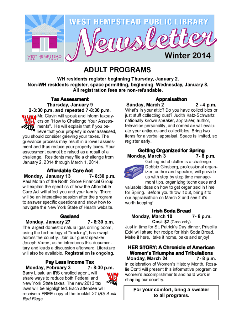 Winter 2014 ADULT PROGRAMS WH residents register beginning Thursday, January 2. Now residents register, space permitting, beginning Wednesday, January 8. All registration fees are nonrefundable. Tax