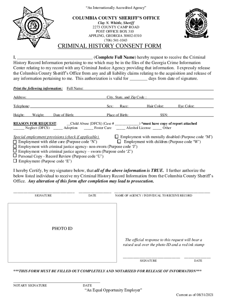 An Internationally Accredited AgencyCOLUMBIA COUNTY SHERIFFS OFFICE Clay N. Whittle, Sheriff 2273 COUNTY CAMP ROAD POST OFFICE BOX 310 APPLYING, GEORGIA 308020310 (706) 5411043CRIMINAL HISTORY CONSENT