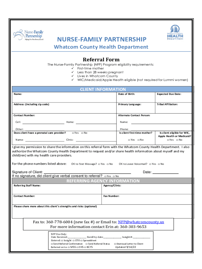 NURSEFAMILY PARTNERSHIPWhatcom County Health Department Referral Form The NurseFamily Partnership (NFL) Program eligibility requirements: First time mother Less than 28 weeks pregnant Lives in Whatcom