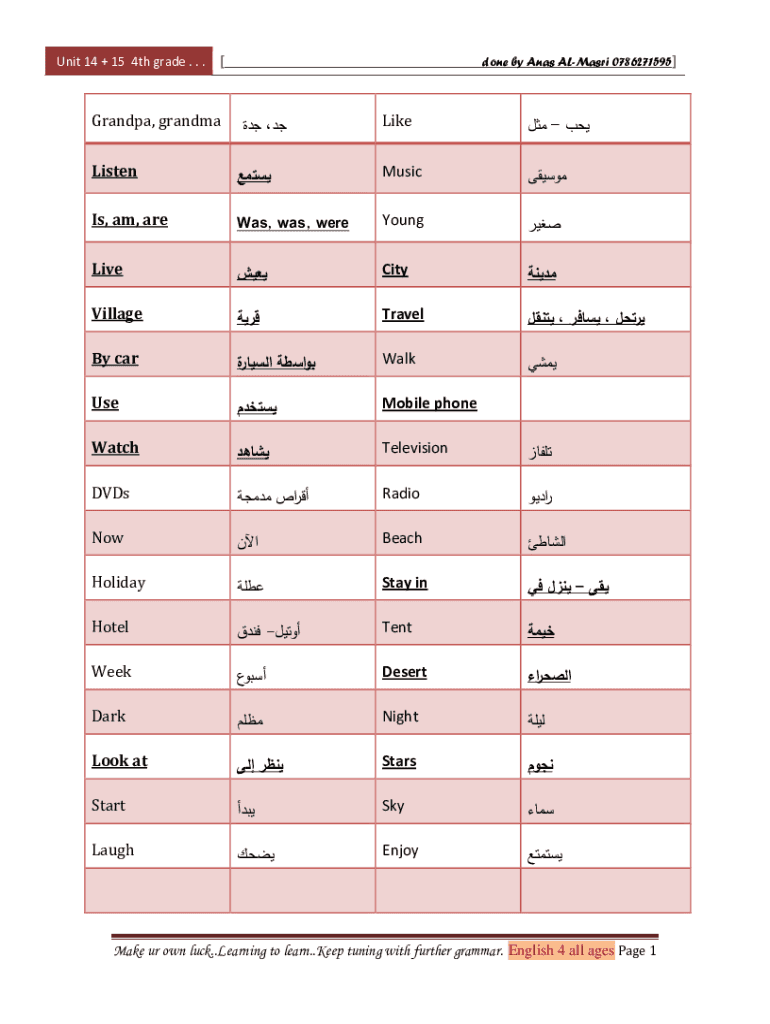 Unit 14 + 15 4th grade. . .[Grandpa, grandma done by Ana's Masri 0786271595] Like MusicListenIs, am, areas, was, wereYoungLiveCityVillageTravel By car WalkUseMobile