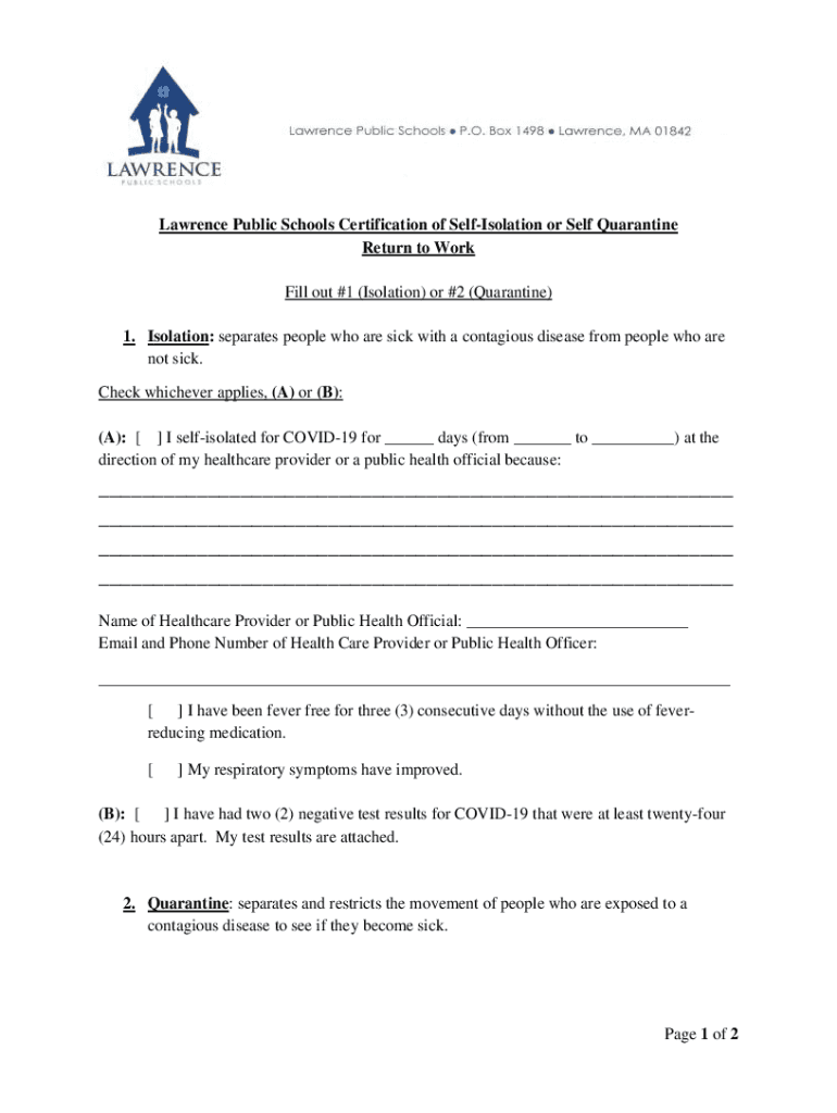 Lawrence Public Schools Certification of Self-isolation or Self Quarantine Return to Work Fill out #1 (Isolation) or #2 (Quarantine) 1. Isolation: separates people who are sick with a contagious disease