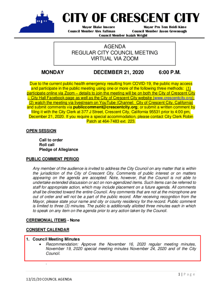 CITY OF CRESCENT CITY Mayor Blake Inshore Mayor Pro Tem Heidi Time Council Member Alex Fall man Council Member Jason Enough Council Member Isaiah WrightAGENDA REGULAR CITY COUNCIL MEETING VIRTUAL