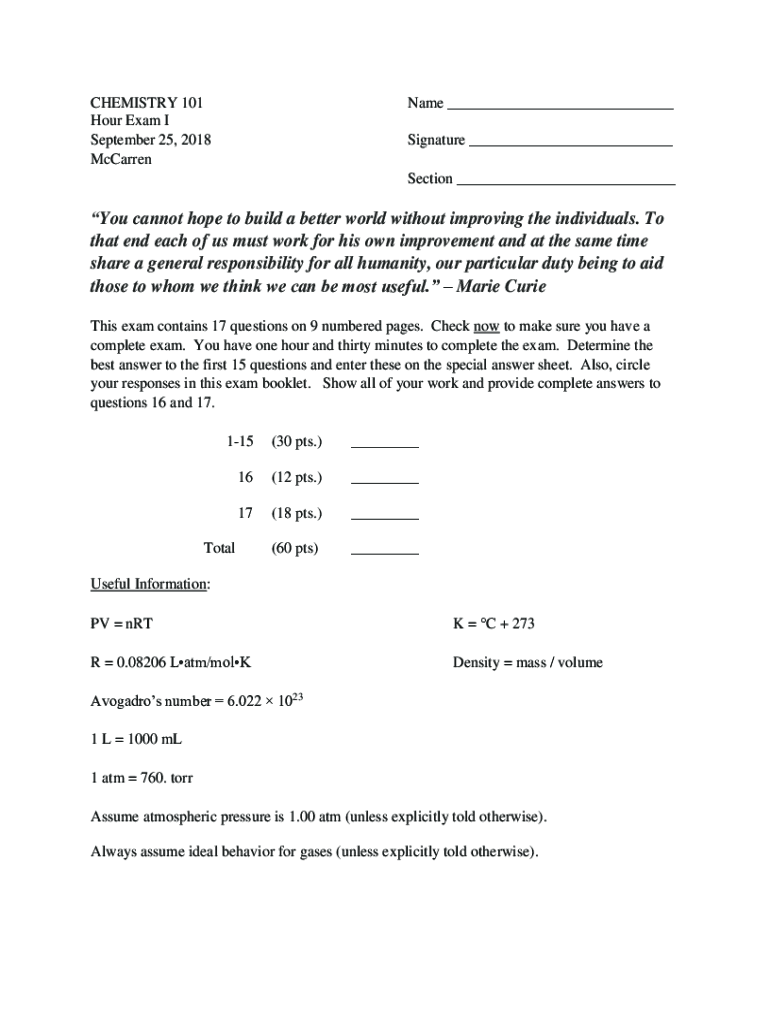 CHEMISTRY 101 Hour Exam I September 25, 2018 McCarrenName ___ Signature ___ Section ___You cannot hope to build a better world without improving the individuals. To that end each of us must work for