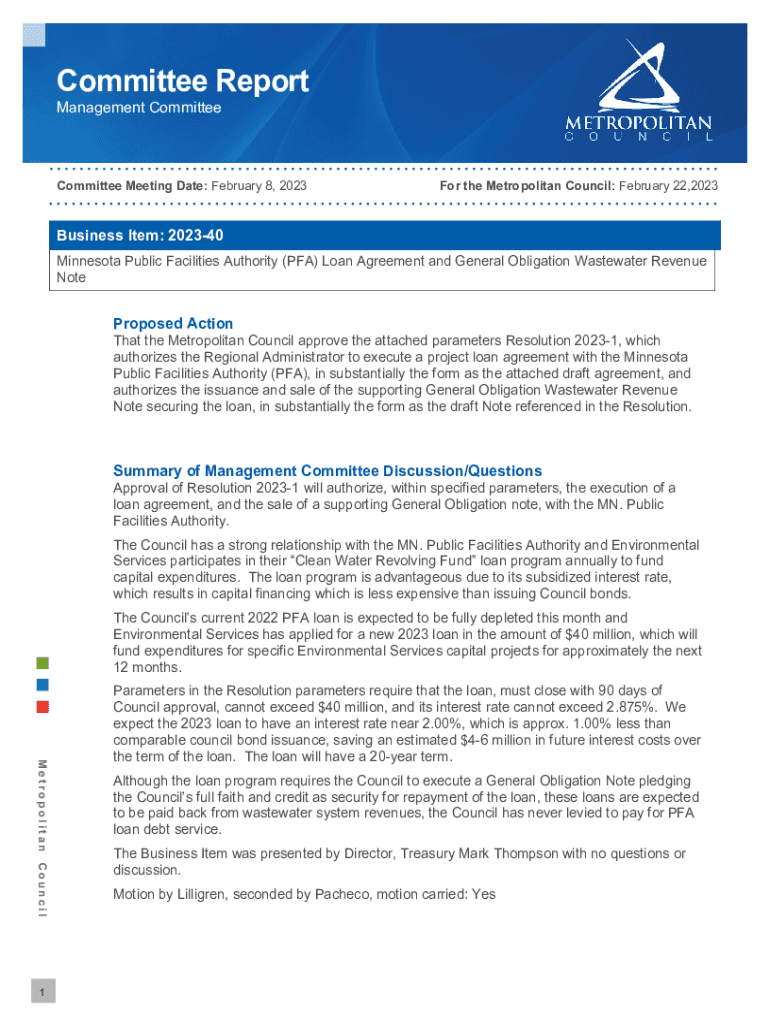 Committee ReportManagement CommitteeCommittee Meeting Date: February 8, 2023For the Metropolitan Council: February 22,2023Business Item: 202340 Minnesota Public Facilities Authority (PFA) Loan Agreement