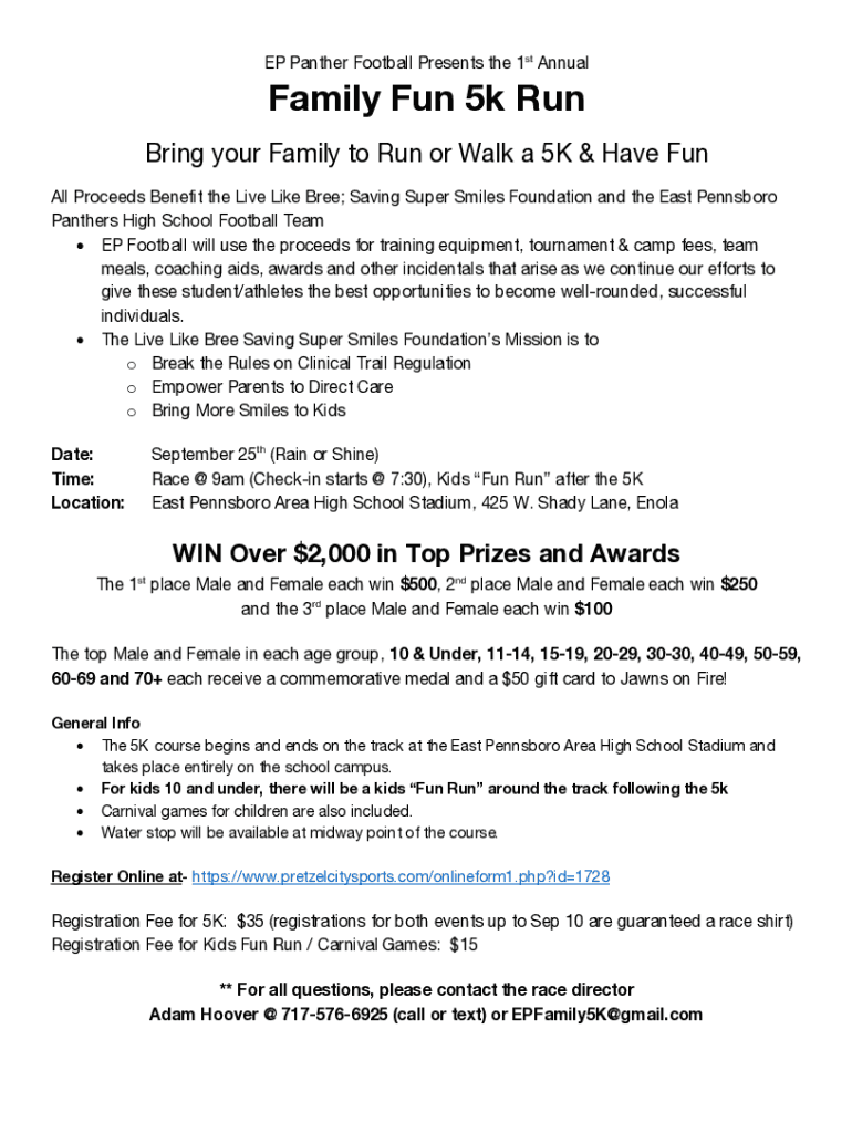 EP Panther Football Presents the 1st AnnualFamily Fun 5k Run Bring your Family to Run or Walk a 5K & Have Fun All Proceeds Benefit the Live Like Bree; Saving Super Smiles Foundation and the East Pennsboro