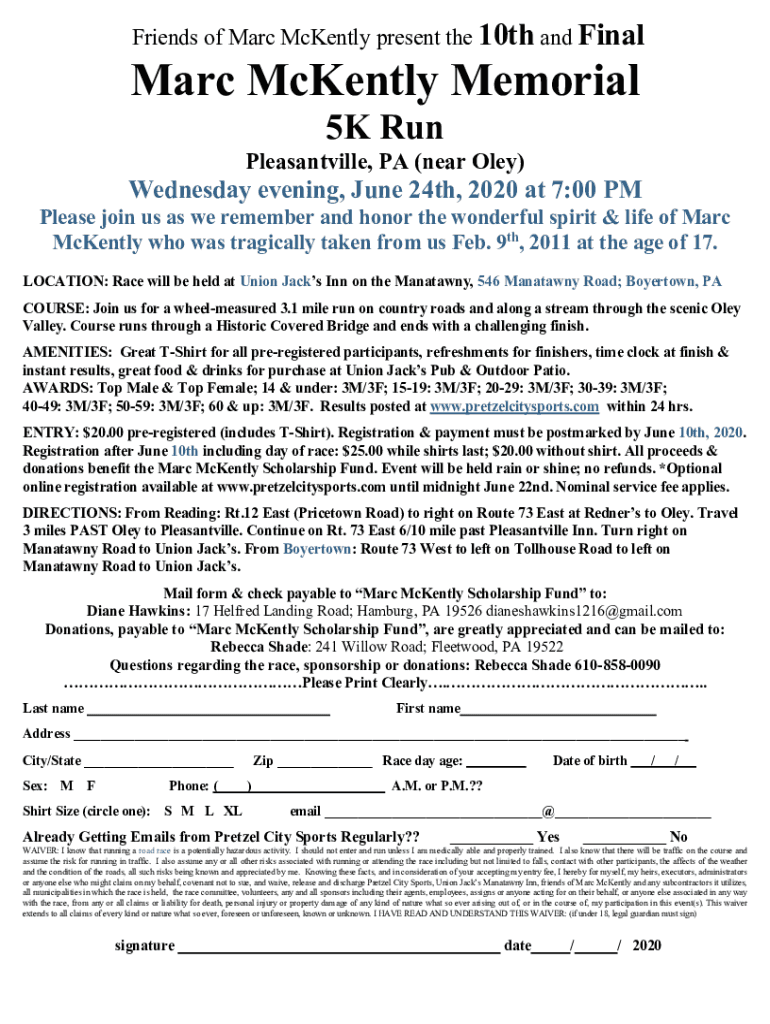 Friends of Marc McKently present the 10th and FinalMarc McKently Memorial 5K Run Pleasantville, PA (near Oley)Wednesday evening, June 24th, 2020 at 7:00 PM Please join us as we remember and honor