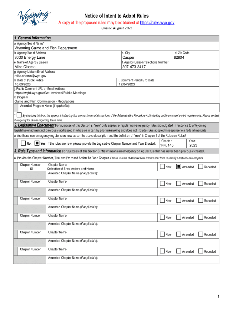 Notice of Intent to Adopt RulesA copy of the proposed rules may be obtained at https://rules.wyo.gov Revised August 20231. General Information a. Agency/Board Name*Wyoming Game and Fish Departmentb.