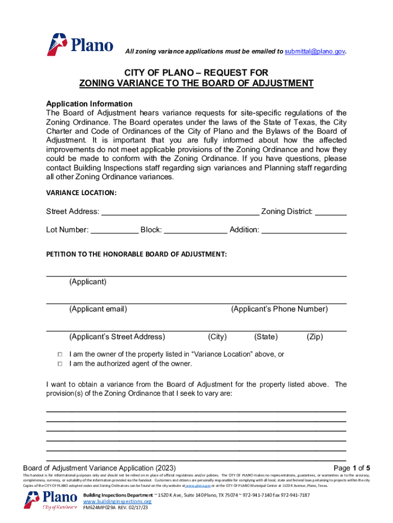 All zoning variance applications must be emailed to submittal@plano.gov.CITY OF PLANO REQUEST FOR ZONING VARIANCE TO THE BOARD OF ADJUSTMENT Application Information The Board of Adjustment hears variance